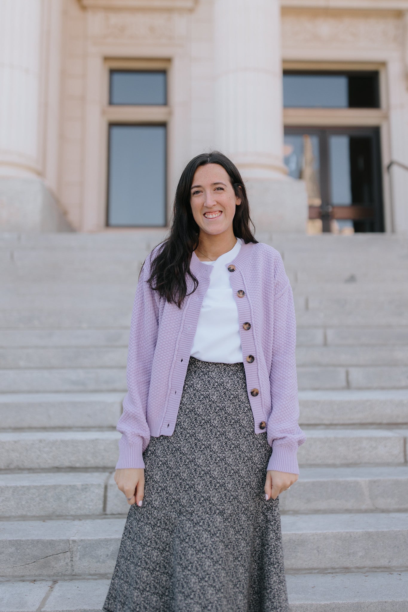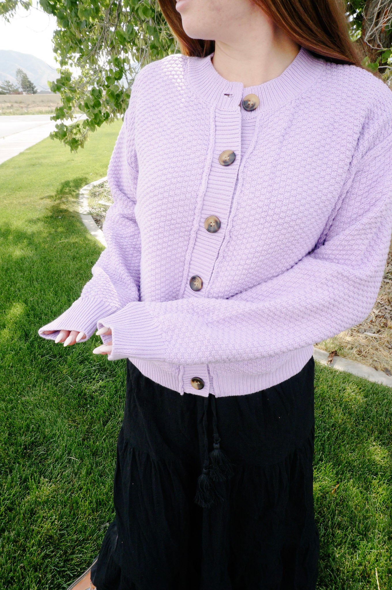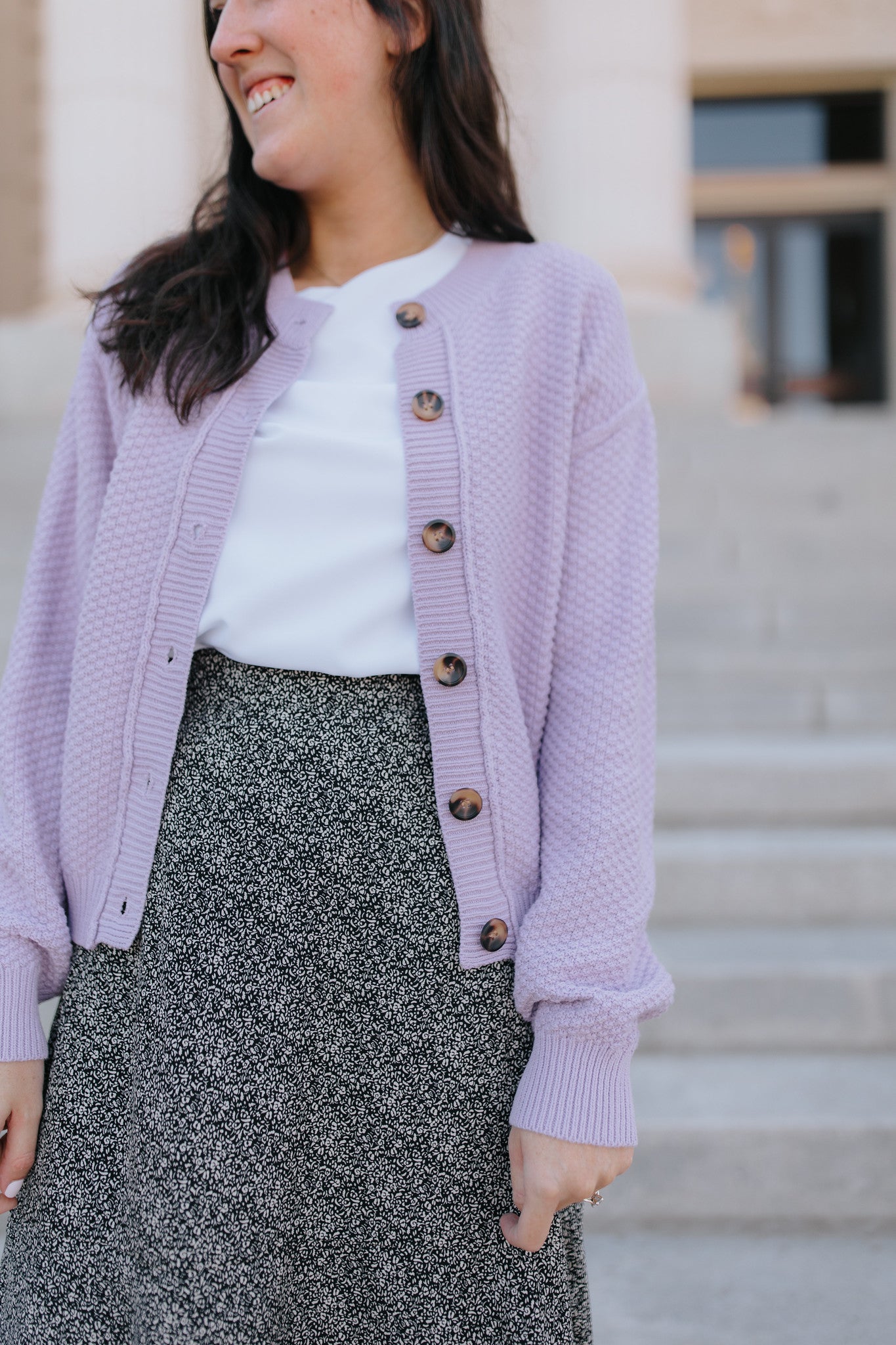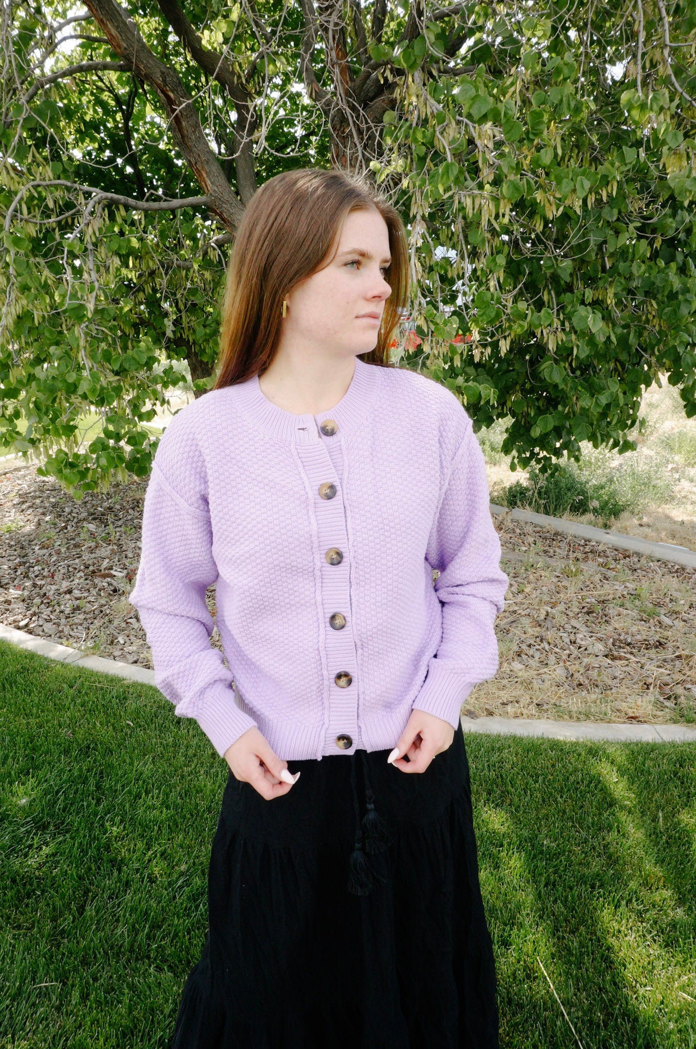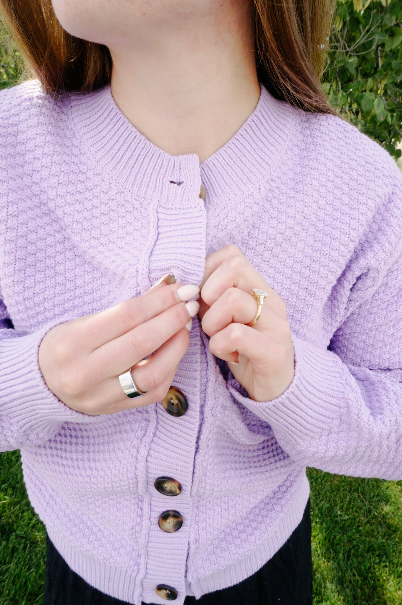 I love this cardigan The chunky buttons are very cute and I also think this color is very fun! The material is great quality!