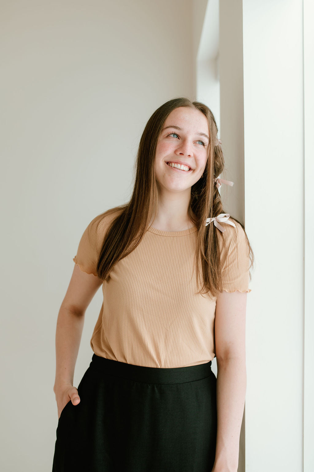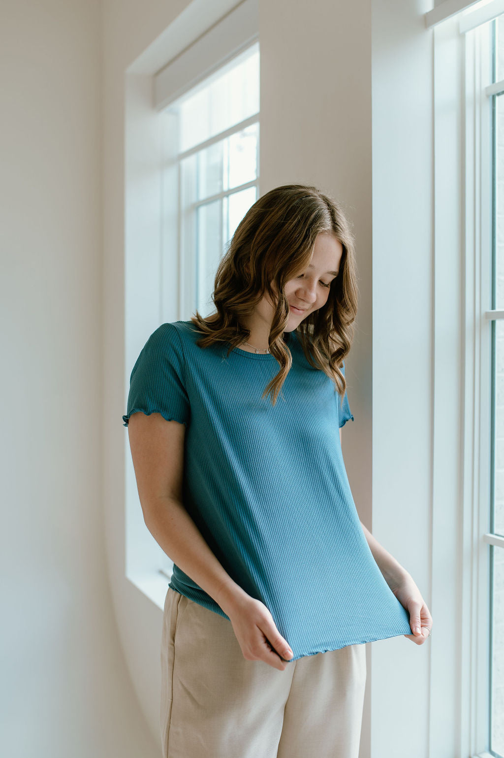 Need a new basic top? Meet the the Dagny Top. The breathable ribbed material and short sleeves make this the perfect mission basic! It comes in 6 COLORS and we think you should get them all!