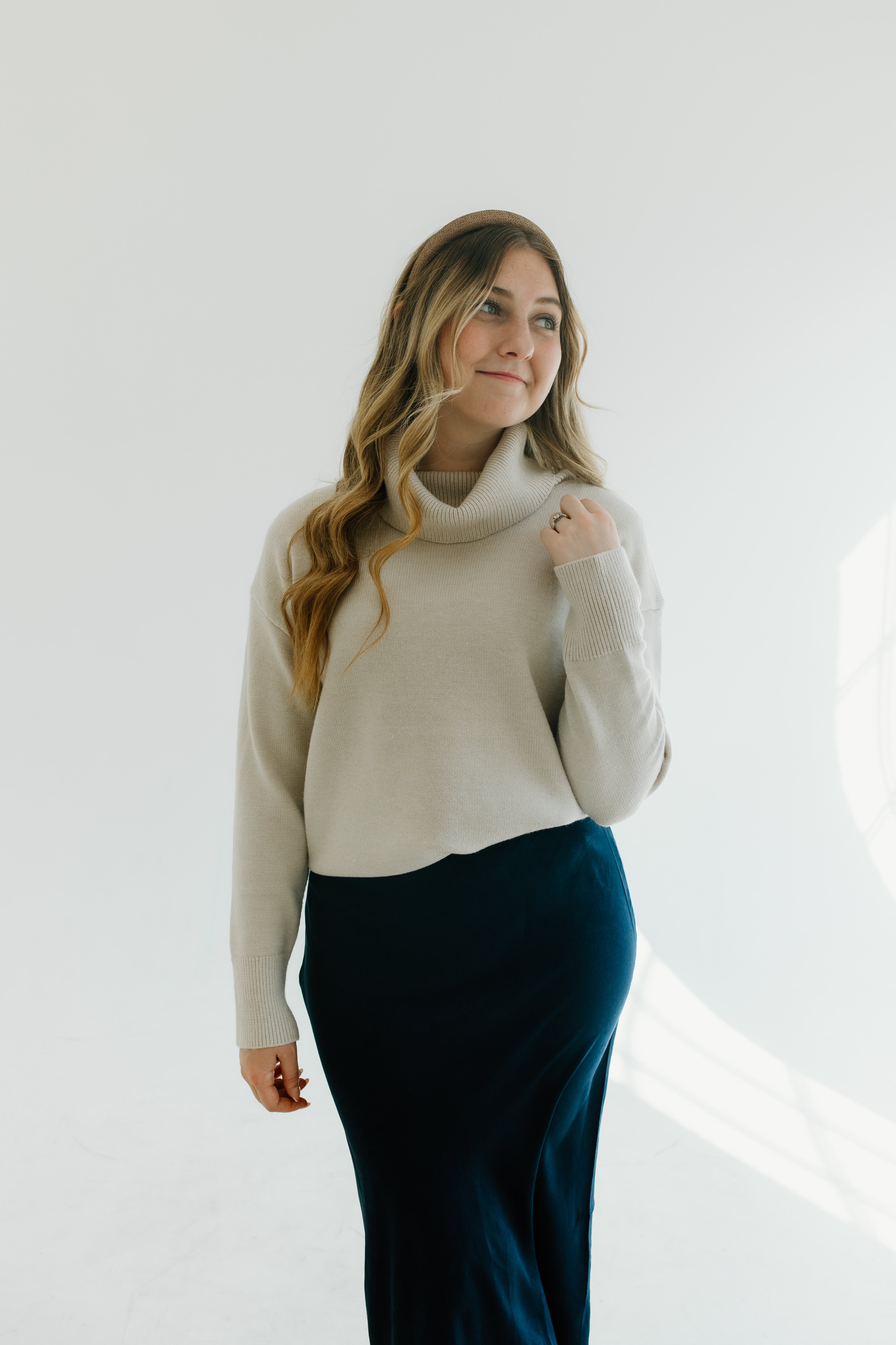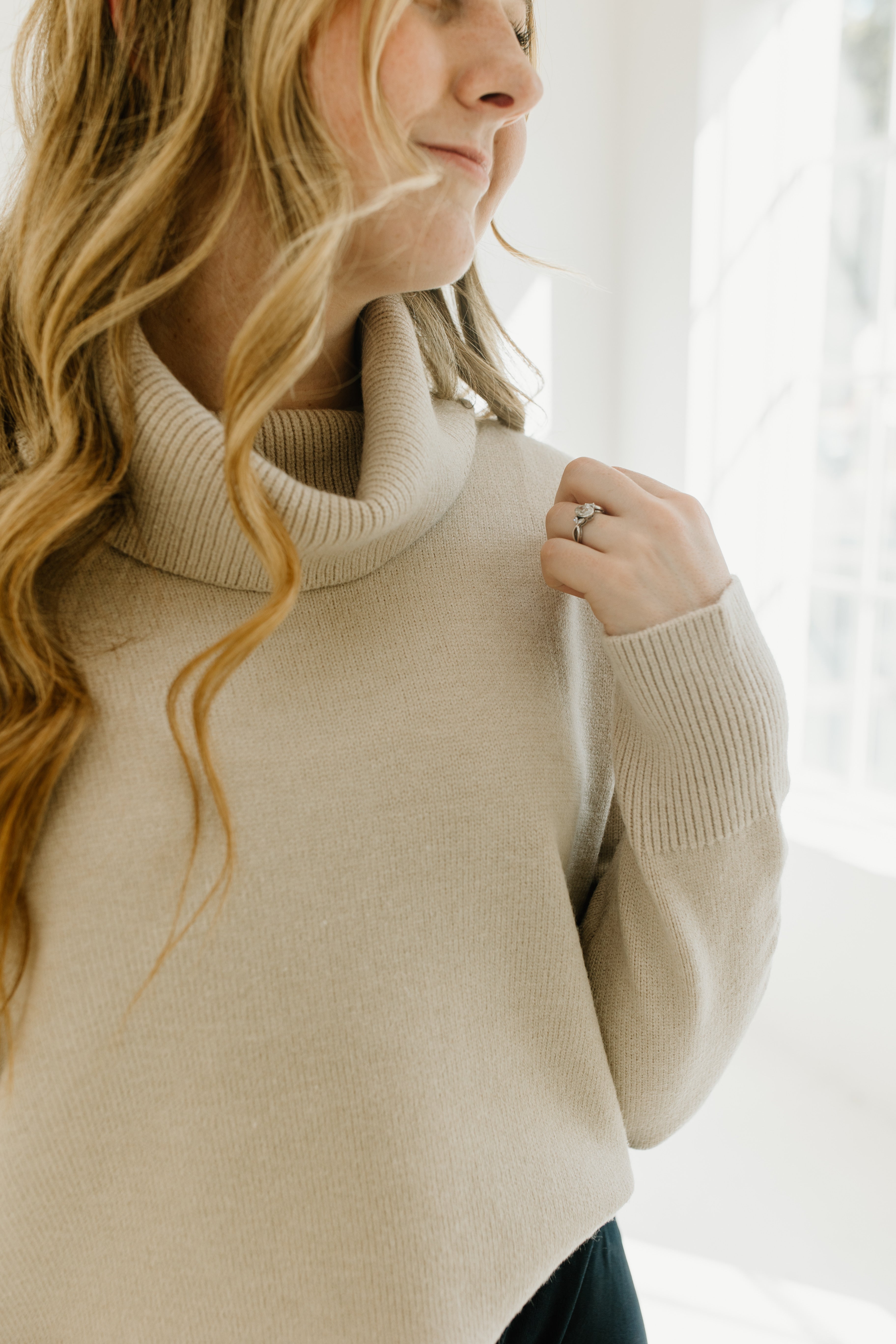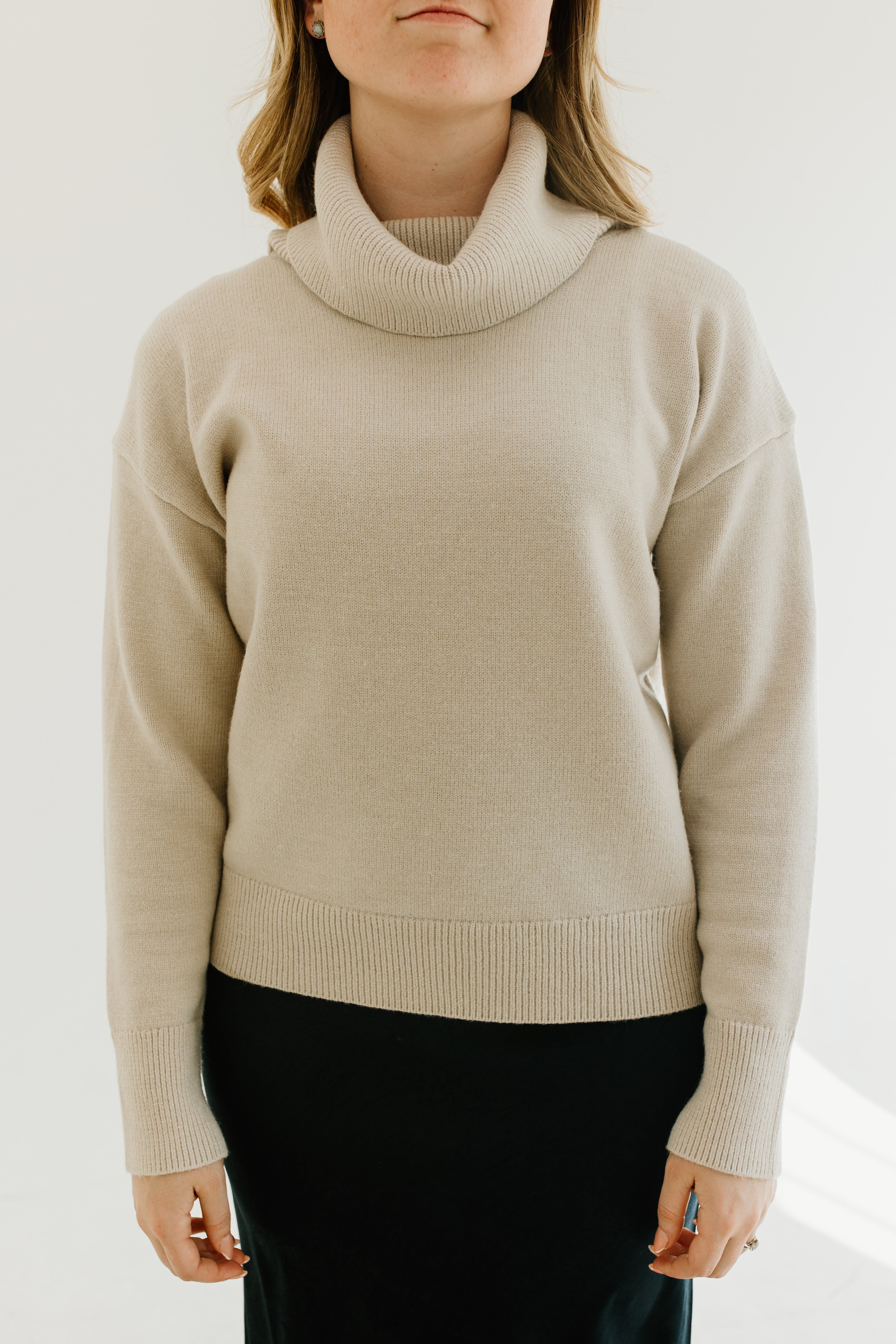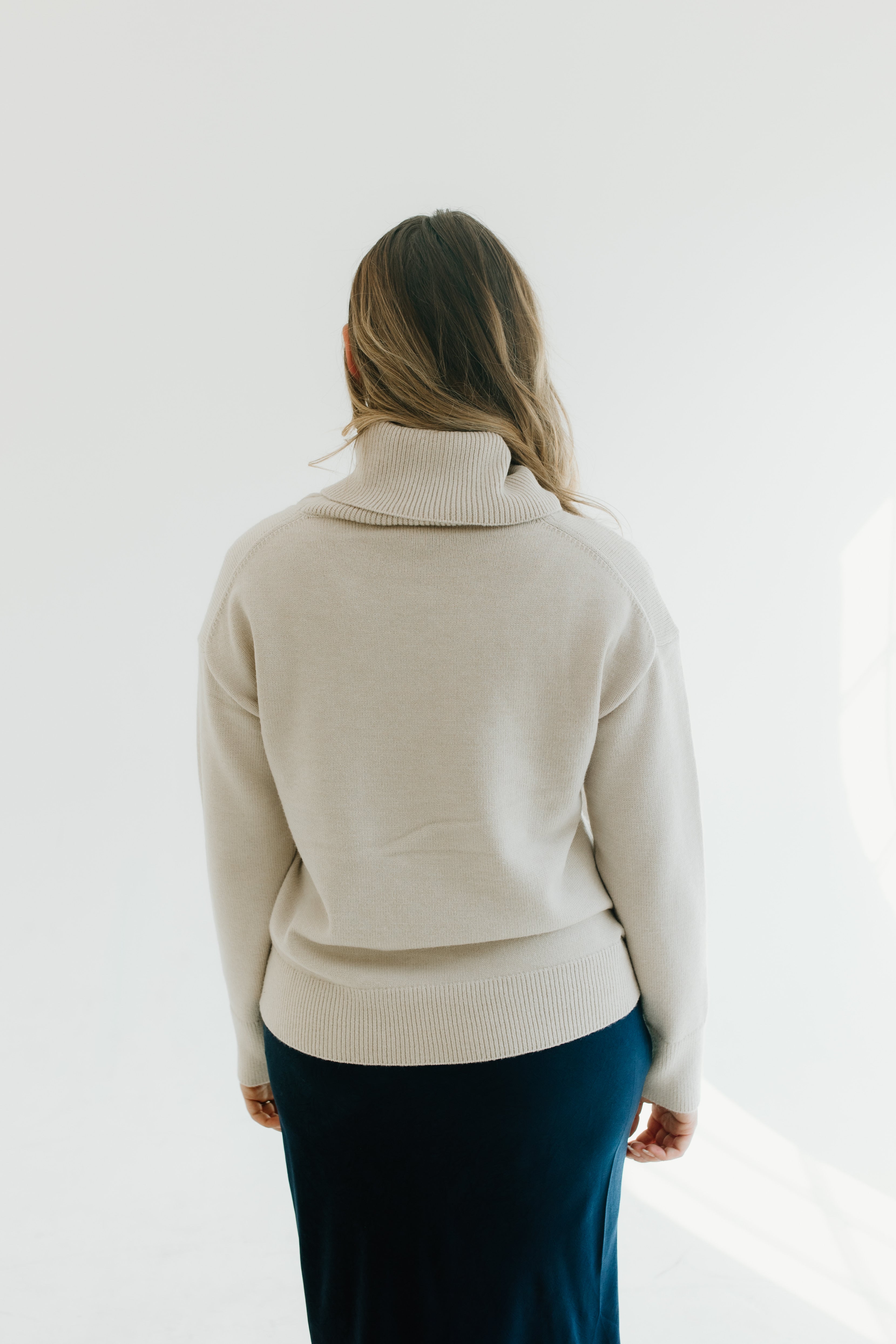 The material on this sweater is super soft and is a warmer, durable sweater. The turtleneck is super fun. I normally am a small and I got this one in a large to have it fit a little bit oversized and to throw it over dresses. I got this in cream but I love it, it washes well., and I would buy this in every color. If you’re thinking about buying it, you won’t regret it!